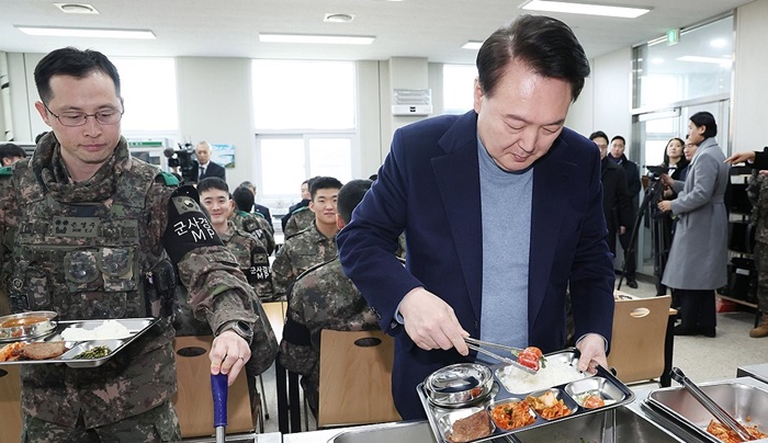 | À±¼®¿ ´ëÅë·ÉÀÌ ¿¬¸»¿¬½Ã¸¦ ¸Â¾Æ 28ÀÏ °æ±âµµ ¿¬Ãµ±º ÁߺΠÀü¼± Àü¹æºÎ´ë °üÃø¼Ò ½Ä´ç¿¡¼ °¡Áø À庴µé°úÀÇ ¿ÀÂù¿¡¼ Á÷Á¢ ¹è½ÄÀ» ¹Þ°í ÀÖ´Ù. /´ëÅë·É½ÇÅë½Å»çÁø±âÀÚ´Ü |