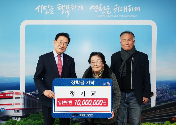 [½Ã»çÄÚ¸®¾ÆÀú³Î=°æºÏÃëÀ纻ºÎ] ¿µÃµ½Ã ´ëâ¸é º´¾Ï¸® ÁÖ¹ÎÀÎ Á¤±â±³ ¾î¸£½ÅÀÌ 28ÀÏ 1,000¸¸ ¿øÀÇ ÀåÇбÝÀ» (Àç)¿µÃµ½ÃÀåÇÐȸ(ÀÌ»çÀå Ãֱ⹮)¿¡ ±âŹÇß´Ù.