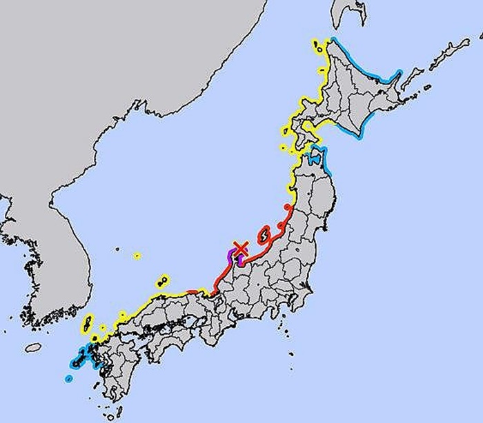| ÀϺ» ±â»óûÀº 1ÀÏ À̽ÃÄ«¿ÍÇö¿¡¼ ¹ß»ýÇÑ °Áø ÈÄ µ¿ÇØÂÊÀ» Á¢ÇÑ ÀϺ» ºÏºÎ ¿¬¾È¿¡ ´ëÇü ¾²³ª¹Ì °æº¸(º¸¶ó»ö)¿Í ¾²³ª¹Ì °æº¸(ºÓÀº»ö), ÁÖÀǺ¸(³ë¶õ»ö) µîÀ» ¹ß·ÉÇß´Ù. /ÀϺ» ±â»óû ȨÆäÀÌÁö ĸó |