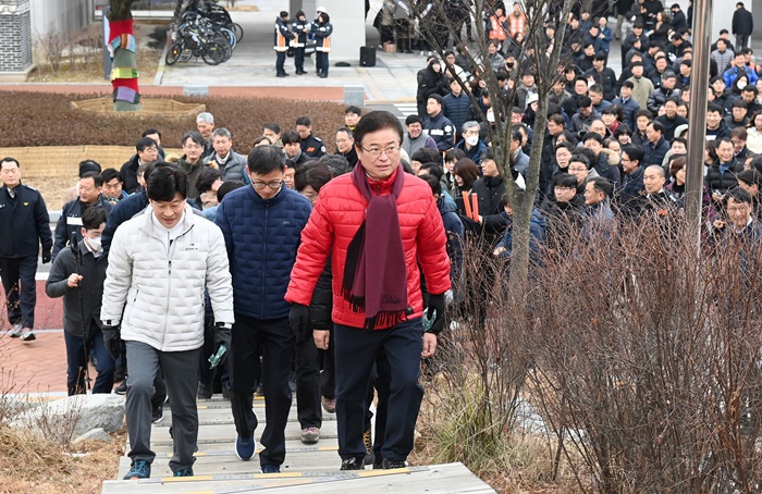 [½Ã»çÄÚ¸®¾ÆÀú³Î=±è¿¬ÇÐ ±âÀÚ] ÀÌö¿ì µµÁö»ç´Â 1¿ù 2ÀÏ °£ºÎ°ø¹«¿øµé°ú ÇÔ²² µµÃ» ´ë±¸·°æºÏ »ó»ýÀÇ ½£¿¡ °Ç¸³ÇÑ °æ»óºÏµµ ¼øÁ÷ °ø¹«¿ø Ã߸ðºñ¸¦ ã¾Æ Âü¹èÇϰí Á÷¿ø 200¿© ¸í°ú °Ë¹«»ê Á¤»ó¿¡ ¿Ã¶ó 2024³â °æºÏÀÇ ÈûÂù ºñ»óÀ» ´ÙÁüÇÏ¸ç »õÇØ¸¦ ½ÃÀÛÇß´Ù.