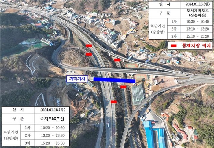°ÅÁ¦½Ã µµ·Î°ú °ü°èÀÚ´Â °ÅÁ¦½Ã ±³Åë°ú(¹ö½º¿îÇà) ¹× °ÅÁ¦°æÂû¼¿Í Çù·ÂÇÏ¿© °Å°¡´ë·Î ½Å¼³ ¼ÛÁ¤IC±³ °Å´õ °ÅÄ¡°ø»ç ½Ã°£(10ºÐ, 3ȸ) µ¿¾È ¾ÈÀüÇÏ°í ¿øÈ°ÇÑ Â÷·® ÅëÇàÀ» À§ÇÏ¿© ÀϽÃÀûÀ¸·Î Àü¸éÅëÁ¦ÇÏ¿© µµ·ÎÀÌ¿ëÀÚÀÇ ÅëÇà ¾ÈÀü°ü¸®¿¡ ÃÖ¼±À» ´ÙÇÒ °ÍÀ̶ó°í ÀüÇß´Ù.
