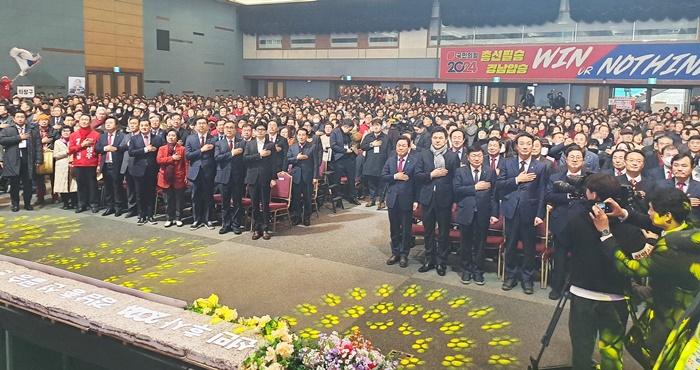 | '±¹¹ÎÀÇÈû °æ³²µµ´ç ½Å³â Àλçȸ'°¡ 10ÀÏ ¿ÀÀü °æ³² â¿ø½Ã ¼º»ê±¸ â¿øÄÁº¥¼Ç¼¾ÅÍ¿¡¼ ¿¸° °¡¿îµ¥ Âü¼®ÀÚµéÀÌ ±¹¹ÎÀǷʸ¦ Çϰí ÀÖ´Ù. |