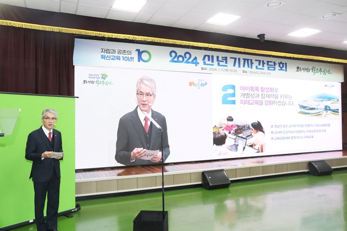 | ¹ÚÁ¾ÈÆ °æ³²±³À°°¨ÀÌ 11ÀÏ ¿ÀÀü º»Ã» ´ëȸÀǽǿ¡¼ 2024³â ½Å³â ±âÀÚ°£´ãȸÀ» ¿°í ¿ÃÇØ ±³À°Á¤Ã¥À» ¼³¸íÇϰí ÀÖ´Ù. |