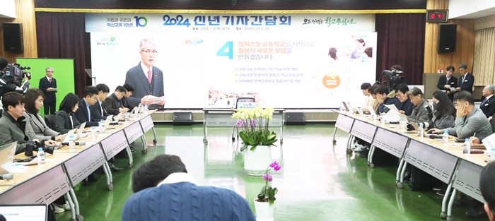 | ¹ÚÁ¾ÈÆ °æ³²±³À°°¨ÀÌ 11ÀÏ ¿ÀÀü º»Ã» ´ëȸÀǽǿ¡¼ 2024³â ½Å³â ±âÀÚ°£´ãȸ¿¡¼ ±âÀÚµéÀÇ Áú¹®¿¡ ´äº¯Çϰí ÀÖ´Ù. |