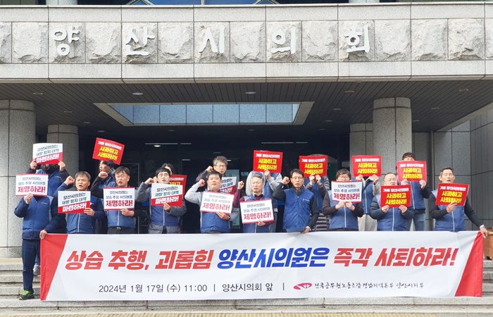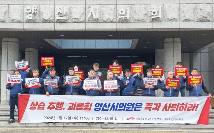 Àü±¹°ø¹«¿ø³ëÁ¶ °æ³²Áö¿ªº»ºÎ´Â 17ÀÏ ¾ç»ê½ÃÀÇȸ ¾Õ¿¡¼ ±âÀÚȸ°ßÀ» ¿°í AÀÇ¿ø¿¡ ´ëÇÑ °æÂûÀÇ ¾öÁ¤ÇÑ ¼ö»ç¸¦ Ã˱¸Çϰí Áï°¢ »çÅðÇÒ °ÍÀ» ¿ä±¸Çß´Ù.