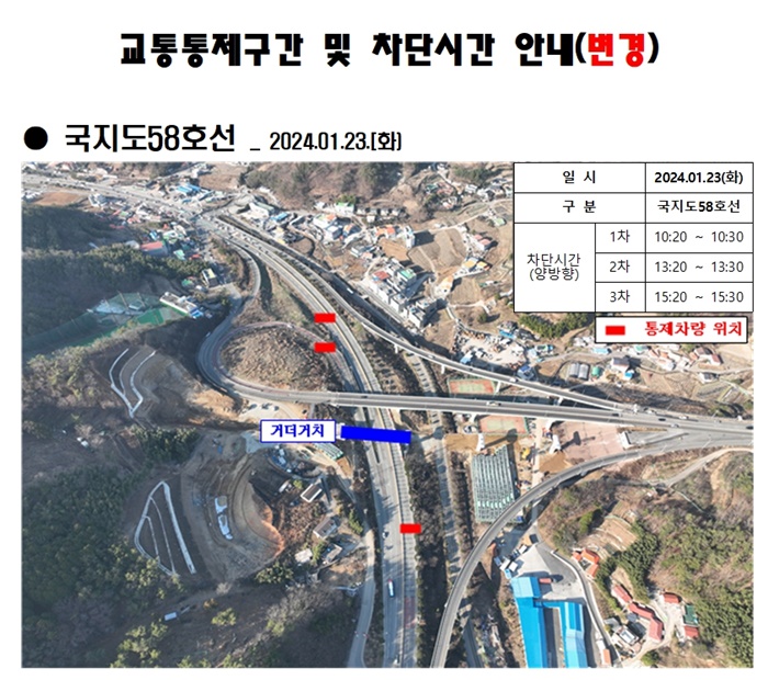 »óºÎ °Å´õ °ÅÄ¡°ø»ç¸¦ À§ÇØ Â÷·® ±³ÅëÅëÁ¦ ±â°£Àº ´çÃÊ 18ÀÏ ÁøÇà ¿¹Á¤µÆÀ¸³ª, ¿ìõÀ¸·Î ÀÎÇØ ÀÛ¾÷ÀÚ ¾ÈÀüÈ®º¸¸¦ À§ÇØ 23ÀÏ(È)·Î º¯°æÇÑ´Ù°í ¹àÇû´Ù.