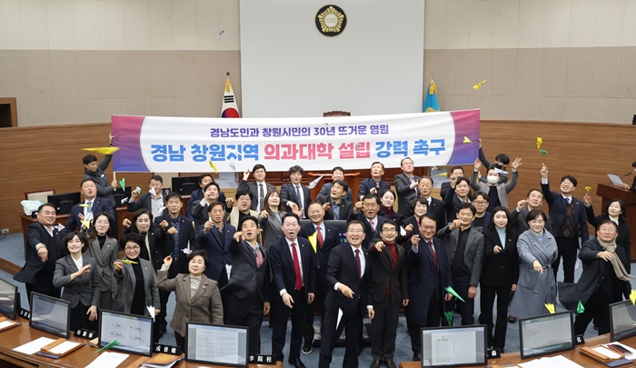 | â¿ø½ÃÀÇȸ ÀÇ¿øµéÀÌ 18ÀÏ ÀÓ½Ãȸ Á¦1Â÷ º»È¸ÀÇ »êȸ ÈÄ “â¿ø Àǰú´ëÇÐ ½Å¼³ÇÏ¶ó” ±¸È£¸¦ ¿ÜÄ¡¸ç Á¾À̺ñÇà±â¸¦ ³¯¸®´Â ÆÛÆ÷¸Õ½º¸¦ Çϰí ÀÖ´Ù. |