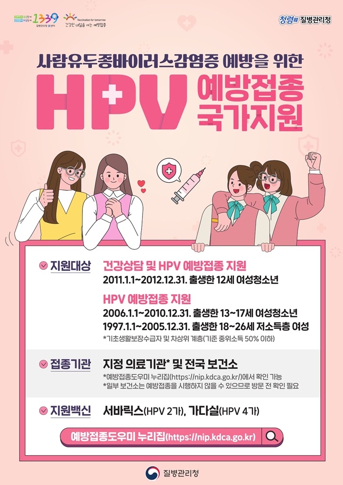 2024³â HPV ±¹°¡¿¹¹æÁ¢Á¾Áö¿ø»ç¾÷ ´ë»óÀÚ´Â 12~17¼¼ ¿©¼ºÃ»¼Ò³â(2006. 1. 1. ~ 2012. 12. 31. Ãâ»ýÀÚ) ¿Í 18~26¼¼ Àú¼ÒµæÃþ ¿©¼º(1997. 1. 1. ~ 2005. 1. 1. Ãâ»ýÀÚ)À̸ç HPV 2°¡(¼¹Ù¸¯½º) ¶Ç´Â HPV4°¡(°¡´Ù½Ç) ¿¹¹æÁ¢Á¾ ºñ¿ëÀ» Áö¿øÇϰí ÀÖ´Ù.