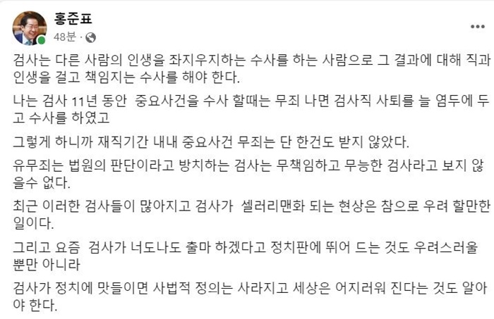 °Ë»ç Ãâ½ÅÀÎ È«ÁØÇ¥ ´ë±¸½ÃÀåÀÌ 29ÀÏ ÀÚ½ÅÀÇ ÆäÀ̽ººÏ¿¡ ¿Ã¸° ±Û¿¡¼ "¿äÁò °Ë»ç°¡ ³Êµµ³ªµµ Ã⸶Çϰڴٰí Á¤Ä¡ÆÇ¿¡ ¶Ù¾î µå´Â °Íµµ ¿ì·Á½º·Æ´Ù"°í ÀÌ·¸°Ô ¸»Çß´Ù.