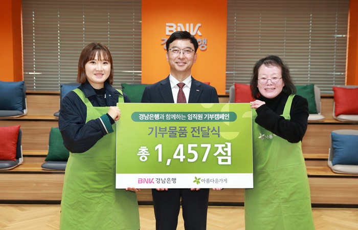 | BNK°æ³²ÀºÇà ÀÓÀç¹® »ó¹«(»çÁø °¡¿îµ¥)°¡ ¾Æ¸§´Ù¿î°¡°Ô °æ³²º»ºÎ Á¤À±Èñ º»ºÎÀå(»çÁø ¿À¸¥ÂÊ Ã¹¹øÂ°)¿¡°Ô ‘¹°Ç° ±âºÎ Áõ¼’¸¦ Àü´ÞÇϰí ÀÖ´Ù. |
