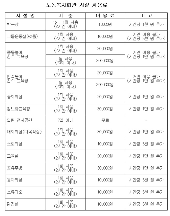 ºÎÁö¸éÀû 6,703§³, ¿¬¸éÀû 4,089.92§³, ÁöÇÏ 1Ãþ¿¡¼ Áö»ó 3Ãþ ±Ô¸ð¸¦ °¡Áø ÀÌ ½Ã¼³Àº º¹Áöȸ°ü ¿î¿µÀ» À§ÇÑ °ü¸®»ç¹«½Ç»Ó¸¸ ¾Æ´Ï¶ó ³ëµ¿ÀÚ¿Í Áö¿ªÁֹεéÀ» À§ÇÑ ³ëµ¿´Üü »ç¹«½Ç, ±³À°½Ç, ȸÀǽÇ, ¿îµ¿½Ç, ºÏÄ«Æä, Àü½Ã °ø°£, °øÀ¯ÁÖ¹æ µîÀ» º¸À¯Çϰí ÀÖ¾î Àú·ÅÇÑ ºñ¿ëÀ¸·Î ´©±¸³ª ½Ã¼³ÀÌ¿ëÀÌ °¡´ÉÇÏ´Ù.