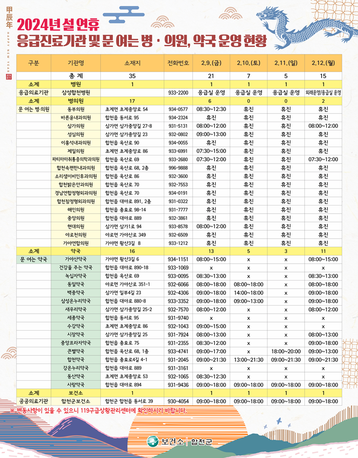 ÇÕõ±º º¸°Ç¼Ò´Â ¼³ ¿¬ÈޱⰣ µ¿¾È ÀÀ±ÞȯÀÚ ¹ß»ý¿¡ ´ëºñÇØ ¡ãº¸°Ç¼Ò¿¡¼ ºñ»óÁø·á ½Ç½Ã ¡ãÁö¿ªÀÀ±ÞÀÇ·á±â°ü »ï¼ºÇÕõº´¿ø 24½Ã°£ ÀÀ±Þ½Ç ¿î¿µ ¡ã±º³» 6°³¼Ò º´․ÀÇ¿ø°ú 13°³¼Ò ¾à±¹Àº ¹® ¿©´Â º´ÀÇ¿ø‧¾à±¹À¸·Î ÁöÁ¤‧¿î¿µÇØ Áö¿ªÁÖ¹Î, ±Í¼º°´ÀÇ ÀÇ·á±â°ü ¹× ¾à±¹ ÀÌ¿ë ºÒÆíÀ» ÃÖ¼ÒÈÇÏ°í ¾ÈÀüÇÑ ¼³ ¸íÀýÀ» º¸³¾ ¼ö ÀÖµµ·Ï ºñ»óÁø·áü°è¸¦ ÃßÁøÇÑ´Ù.