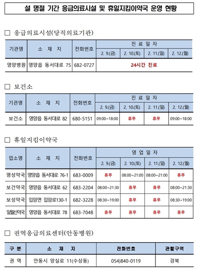 ¿µ¾ç±ºº¸°Ç¼Ò¿¡¼´Â À̹ø 4ÀÏÀÇ ¿¬ÈޱⰣ Áß 9ÀÏ(±Ý)°ú 12ÀÏ(¿ù) 2Àϰ£Àº Á¤»óÁø·á¸¦ Çϸç, ´çÁ÷ÀÇ·á±â°üÀÎ ¿µ¾çº´¿øÀº 24½Ã°£ ÀÀ±Þ½Ç ¿î¿µÀ¸·Î ÁֹΠºÒÆíÀ» ÃÖ¼ÒÈÇϱâ·Î Çß´Ù.