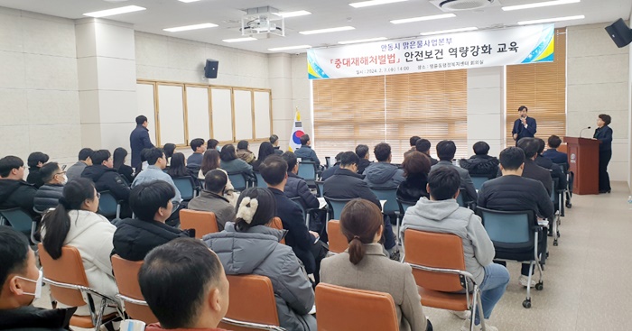 [½Ã»çÄÚ¸®¾ÆÀú³Î=±è¿¬ÇÐ ±âÀÚ] ¾Èµ¿½Ã ¸¼Àº¹°»ç¾÷º»ºÎ(º»ºÎÀå ±èµµ¼±)´Â 7ÀÏ ¸í·ûµ¿ÇàÁ¤º¹Áö¼¾ÅÍ È¸Àǽǿ¡¼ º»ºÎ ¼Ò¼Ó ÀüÁ÷¿ø°ú »ó·Çϼöµµ °ø»ç ´ëÇà¾÷ü °ü°èÀÚ 80¿© ¸íÀ» ´ë»óÀ¸·Î Áß´ëÀçÇØ¿¹¹æ ¹× ¾ÈÀü»ç°í ¹ß»ý ½Ã ´ëÀÀ´É·Â Çâ»óÀ» À§ÇÑ ‘Áß´ëÀçÇØÃ³¹ú¹ý ¾ÈÀüº¸°Ç¿ª·®°È ±³À°’À» ½Ç½ÃÇß´Ù.
