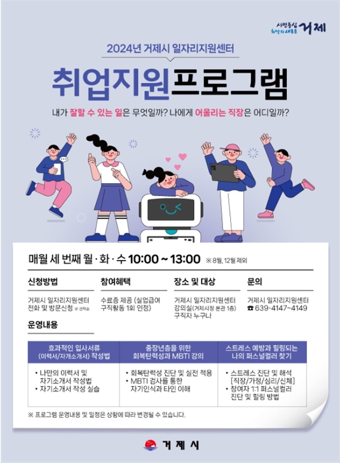 Ãë¾÷Áö¿ø ÇÁ·Î±×·¥Àº °ÅÁ¦½Ãû 1Ãþ ÀÏÀÚ¸®Áö¿ø¼¾ÅÍ¿¡¼ ¸Å¿ù ¼¼ ¹øÂ° ¿ù·È·¼ö¿äÀÏ ¿ÀÀü 10½ÃºÎÅÍ ÁøÇàµÇ¸ç, ¡ãÈ¿°úÀûÀÎ ÀԻ缷ù(À̷¼/ÀÚ±â¼Ò°³¼) ÀÛ¼º¹ý ¡ãÁßÀå³âÃþÀ» À§ÇÑ È¸º¹Åº·Â¼º°ú MBTI °ÀÇ ¡ã½ºÆ®·¹½º ¿¹¹æ°ú Èú¸µµÇ´Â ³ªÀÇ ÆÛ½º³ÎÄ÷¯ ã±â·Î ±¸¼ºµÈ´Ù.