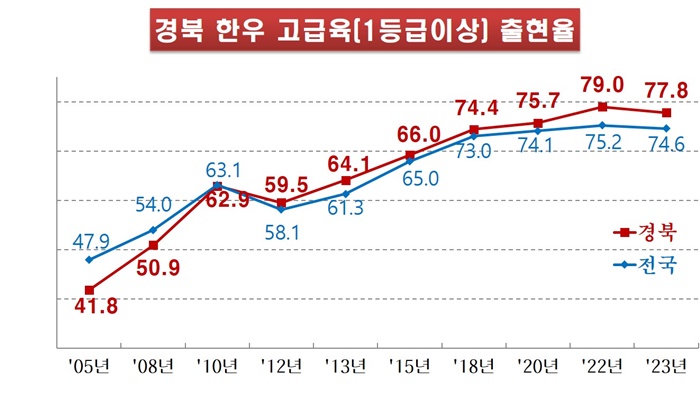 °æºÏÇÑ¿ì À°Áú 1µî±Þ ÀÌ»ó ÃâÇöÀ²Àº 2022³â 79.0%, 2023³â 77.8%·Î 2³â ¿¬¼Ó Àü±¹ 1À§¸¦ ´Þ¼ºÇØ ±¹³» ÇÑ¿ì °í±ÞÀ° ½ÃÀåÀ» ¼±µµÇϰí ÀÖ´Ù.