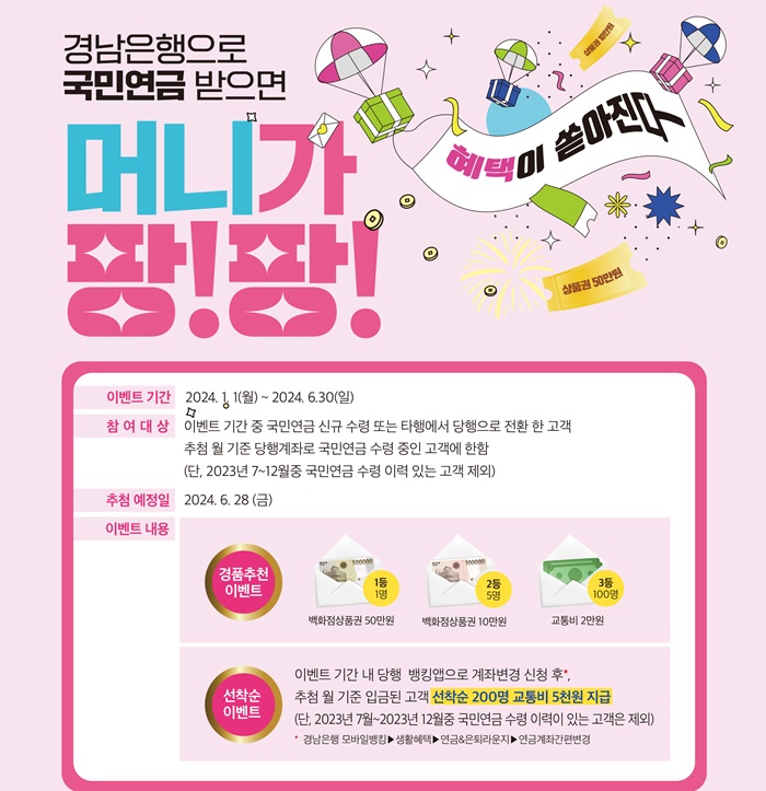 À̺¥Æ® ±â°£ µ¿¾È ±¹¹Î¿¬±ÝÀ» ½Å±Ô·Î ¼ö·ÉÇϰųª ¶Ç´Â ´Ù¸¥ ÀºÇà¿¡¼ BNK°æ³²ÀºÇàÀ¸·Î ¿¬±Ý¼ö·É°èÁ¸¦ ÀüȯÇÑ °í°´À» ´ë»óÀ¸·Î Ãß÷À» ÅëÇØ ǪÁüÇÑ °æÇ°À» Á¦°øÇÑ´Ù.