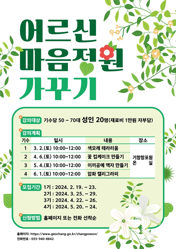 °ÅââÆ÷¿ø ȨÆäÀÌÁö(geochang.go.kr/changpowon/)¸¦ ÅëÇØ 2~5¿ù ¼Â° ÁÖ ¿ù¿äÀϺÎÅÍ ´ÙÀ½ ´Þ ÇÁ·Î±×·¥À» ½ÅûÇÒ ¼ö ÀÖ´Ù.