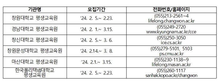 Âü¿© ±â°üÀº â¿ø½Ã °ü³»¿¡ ¼ÒÀçÇÑ Ã¢¿ø´ëÇб³, °æ³²´ëÇб³, â½Å´ëÇб³, â¿ø¹®¼º´ëÇб³, ¸¶»ê´ëÇб³, Çѱ¹Æú¸®ÅØ¥¶´ëÇб³ ÃÑ 6°³ ´ëÇÐÀÇ Æò»ý±³À°¿øÀ̸ç, ±â°üº°·Î Áö¿ª¹ÎÀÇ ¼ö¿ä¿¡ ¸Â´Â ´Ù¾çÇÑ Æò»ý±³À° ÇÁ·Î±×·¥ÀÌ ¿î¿µµÉ ¿¹Á¤ÀÌ´Ù.