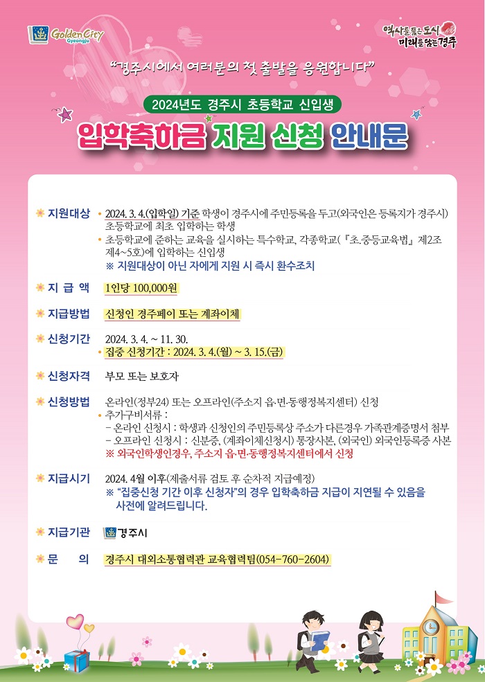 [½Ã»çÄÚ¸®¾ÆÀú³Î=°æºÏÃëÀ纻ºÎ] °æÁֽð¡ Áö³ÇØ¿¡ ÀÌ¾î ¿ÃÇØµµ ÃʵîÇб³ ÀÔÇÐÃàÇϱݰú Áß·°í±³ ½ÅÀÔ»ýÀÇ ±³º¹±¸ÀÔºñ¸¦ Áö¿øÇÑ´Ù°í 25ÀÏ ¹àÇû´Ù.