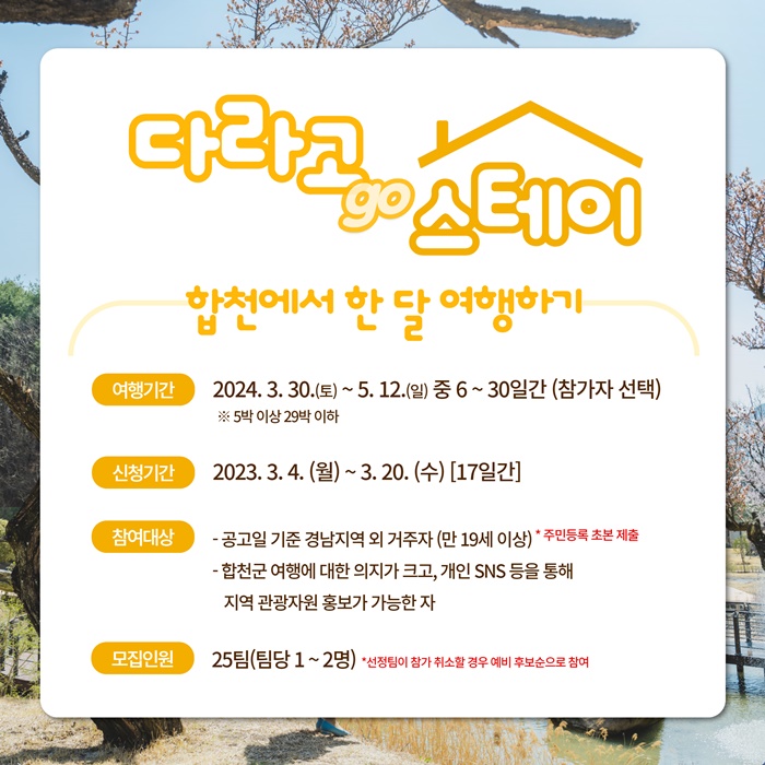 Âü¿©´ë»óÀº ¸¸ 19¼¼ ÀÌ»ó °æ³²Áö¿ª ¿Ü °ÅÁÖÀÚ·Î, Âü°¡ÀÚ´Â °³ÀÎ SNS¿¡ 1ÀÏ 2°Ç ÀÌ»ó ÇÕõ¿©Çà °ü·Ã È«º¸ Æ÷½ºÆÃÀ» ¿Ã¸®´Â °úÁ¦¸¦ ¼öÇàÇÑ ÈÄ È«º¸½ÇÀû°ú ¿µ¼öÁõÀ» Á¦ÃâÇϸé Áö¿ø½ÅûÀÏ ´ÙÀ½ ´Þ ¼÷¹Úºñ¿Í üÇèºñ¸¦ Áö±Þ ¹ÞÀ» ¼ö ÀÖ´Ù.