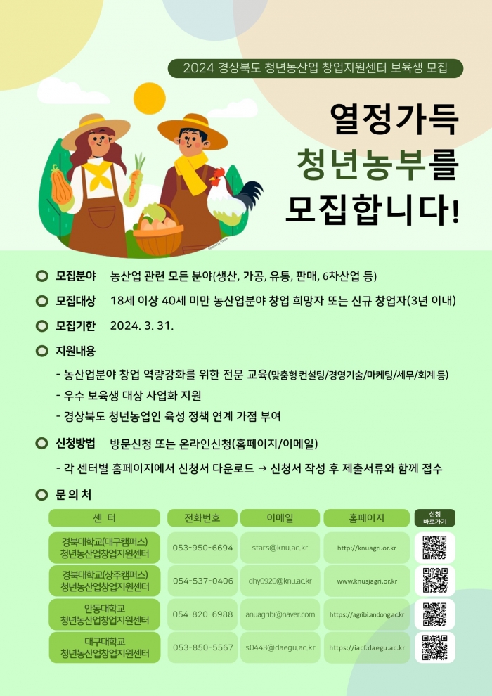 [½Ã»çÄÚ¸®¾ÆÀú³Î=±è¿¬ÇÐ ±âÀÚ] °æºÏµµ´Â ³ó»ê¾÷ ºÐ¾ß ¿¹ºñ û³ââ¾÷ÀÚ¸¦ ´ë»óÀ¸·Î 2024³â û³â³ó»ê¾÷â¾÷Áö¿ø¼¾ÅÍ º¸À°»ýÀ» ¸ðÁýÇÑ´Ù.