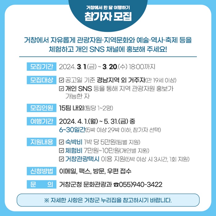 ¸¸19¼¼ ÀÌ»ó °æ³²Áö¿ª ¿Ü °ÅÁÖÀÚ´Â ´©±¸³ª 1∼2¸íÀ¸·Î ÆÀÀ» ±¸¼ºÇØ Âü¿©ÇÒ ¼ö ÀÖ°í, °ÅâÀ» ¿©ÇàÇÏ´Â µ¿¾È °ÅâÀÇ ´Ù¾çÇÑ °ü±¤ÀÚ¿øÀ» °³ÀÎ SNS¸¦ ÅëÇØ Àü±¹¿¡ È«º¸ÇÏ¸é µÈ´Ù.