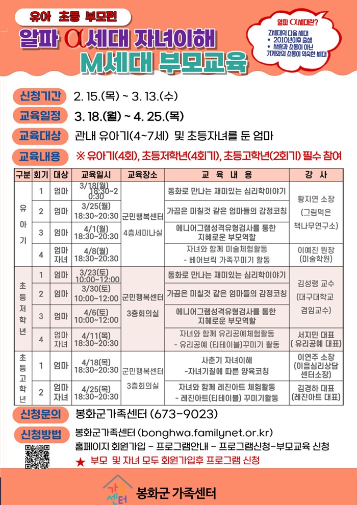 ÀÌ ÇÁ·Î±×·¥Àº ‘M¼¼´ë’ ºÎ¸ð¿Í 2010³â ÀÌÈÄ Ãâ»ý ‘¾ËÆÄ¼¼´ë’ ÀÚ³à¿ÍÀÇ ¼ÒÅëÀ» À§ÇØ ±âȹµÆ´Ù. ¶ÇÇÑ ÀÚ³àÀÇ ¿¬·É¿¡ µû¶ó À¯¾Æ±â, ÃʵîÀúÇгâ, Ãʵî°íÇг⠼¼ ÇÁ·Î±×·¥À¸·Î ÁøÇàµÉ ¿¹Á¤ÀÌ´Ù.
