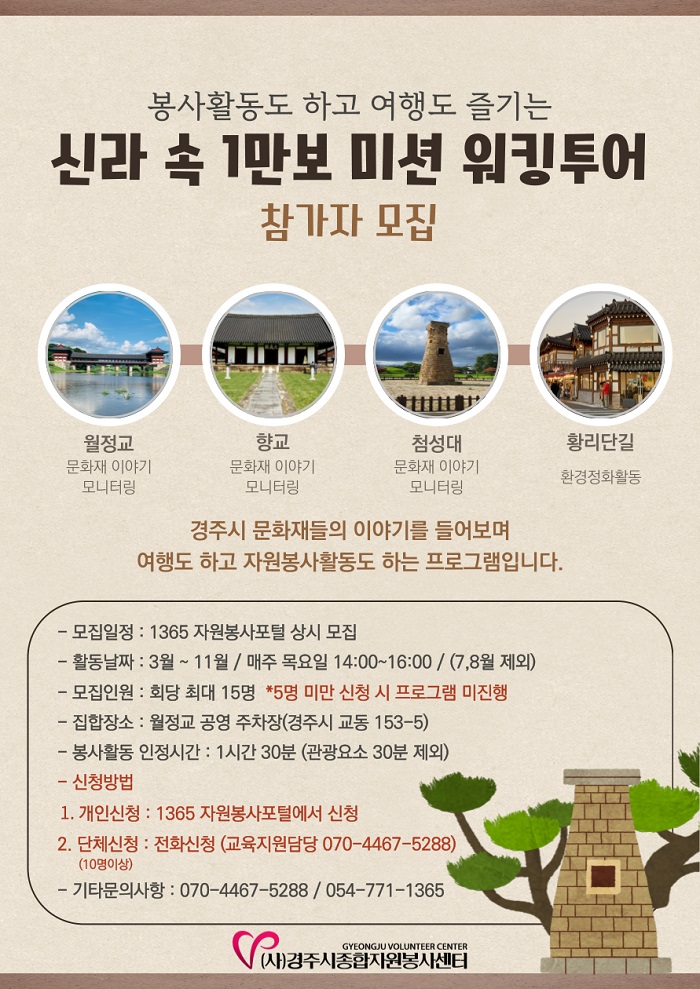 ‘½Å¶ó ¼Ó 1¸¸º¸ ¹Ì¼Ç ¿öÅ·Åõ¾î’´Â °æÁÖ¿ª»çÀ¯Àû ¿ù¼ºÁö±¸¸¦ ¹®ÈÇØ¼³»ç¿Í ÇÔ²² ¾à 1¸¸º¸¸¦ °ÉÀ¸¸ç ¹®ÈÀç ¸ð´ÏÅ͸µ Ȱµ¿À» ÁøÇàÇϰí, °ü±¤°´ À¯ÀÔÀÌ ¸¹Àº Ȳ¸®´Ü±æ ÀÏ´ë¿¡ ȯ°æÁ¤È Ȱµ¿À» ½Ç½ÃÇÏ´Â ÀÚ¿øºÀ»ç ÇÁ·Î±×·¥ÀÌ´Ù.