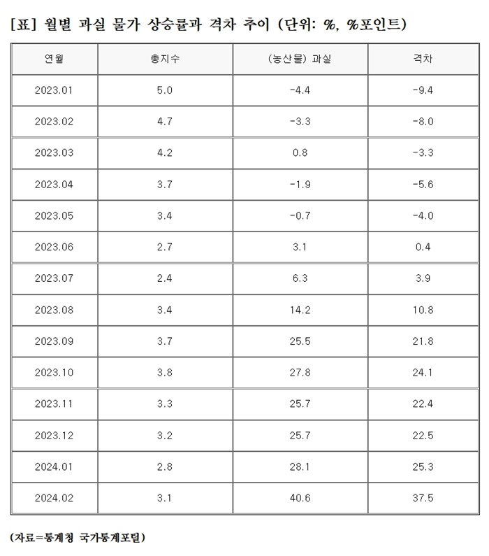 Áö³´Þ °ú½Ç ¹°°¡ »ó½Â·ü°ú Àüü ¼ÒºñÀÚ¹°°¡ »ó½Â·ü °£ °ÝÂ÷°¡ ¿ª´ë Ãִ븦 ±â·ÏÇß´Ù.