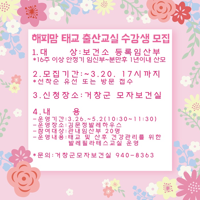 À̹ø ű³·Ãâ»ê±³½ÇÀº ÀӽŠÁß °Ç°°ü¸®¿Í Ãâ»êºÎÀÇ »êÈÄÁ¶¸®¸¦ À§ÇÑ »ç¾÷À¸·Î, °ü³» ÀÓ»êºÎ 20¸íÀ» ´ë»óÀ¸·Î ÁÖ 2ȸ(È, ¸ñ 10:30~11:30) ¹ß·¹ÇʶóÅ×½º±³½ÇÀ» ¿î¿µÇÒ ¿¹Á¤ÀÌ´Ù.