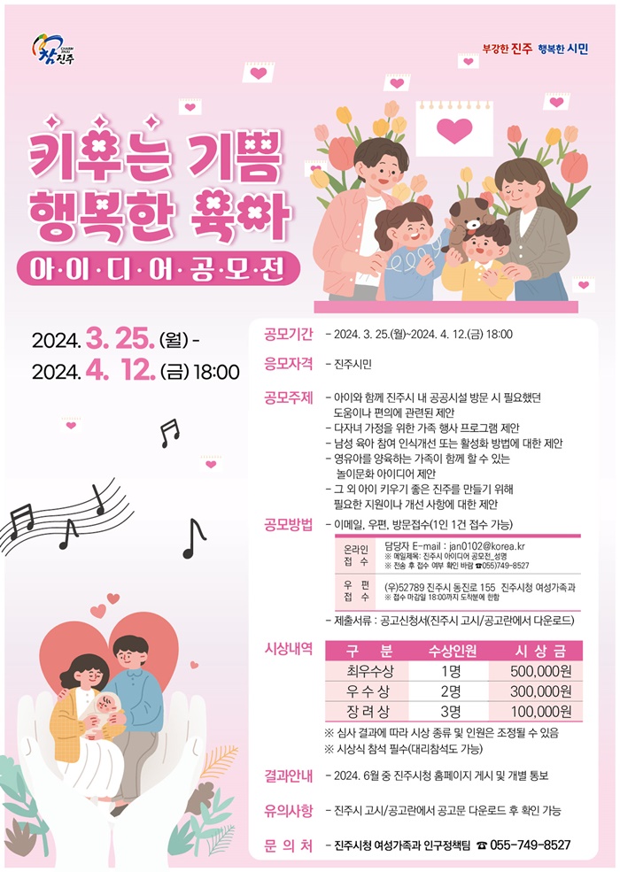 ÀÚ³à ¾çÀ°À» ÁöÁöÇϰí Áö¿ªÀÌ ÇÔ²²ÇÏ´Â ºÐÀ§±â Á¶¼ºÀ» À§ÇÑ À°¾Æ ¾ÆÀ̵ð¾î °ø¸ðÀüÀÇ ÁÖÁ¦´Â ¡â¾ÆÀÌ¿Í ÇÔ²² ÁøÁֽà °ø°ø½Ã¼³ ¹æ¹® ½Ã ÇÊ¿äÇÑ ÆíÀÇ»çÇ× ¡â´ÙÀÚ³à °¡Á¤À» À§ÇÑ °¡Á· Çà»ç ÇÁ·Î±×·¥ ¡â³²¼º À°¾Æ Âü¿© Àνݳ¼±·È°¼ºÈ ¹æ¾È ¡â¿µÀ¯¾Æ ¾çÀ° °¡Á·À» À§ÇÑ ³îÀ̹®È ¾ÆÀ̵ð¾î ¡â±× ¿Ü ¾ÆÀÌŰ¿ì±â ÁÁÀº ÁøÁÖ¸¦ ¸¸µé±â À§ÇØ ÇÊ¿äÇÑ Áö¿øÀ̳ª °³¼±»çÇ׿¡ ´ëÇÑ Á¦¾ÈÀÌ´Ù.