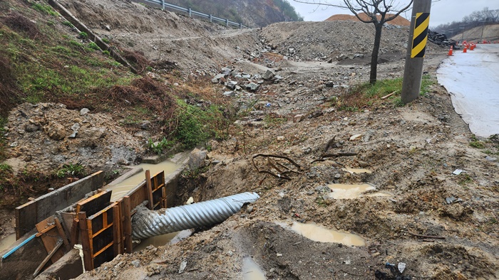 °æÈ£°À¸·Î ¼³Ä¡µÈ ¹è¼ö·Î¿¡¼´Â °ø»çÇöÀåÀÇ Åä»ç¹°ÀÌ ¾Æ¹«·± ¿©°úÀåÄ¡ ¾øÀÌ Èê·¯µé°í ÀÖ´Ù.