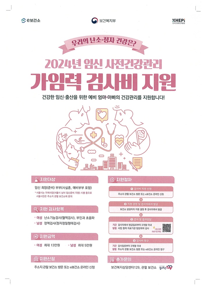 ¿©¼º¿¡°Ô´Â ³¼Ò±â´É°Ë»ç(AMH, ÀÏ¸í ‘³¼Ò³ªÀ̰˻ç’)¿Í ºÎÀΰú ÃÊÀ½ÆÄ °Ë»ç µî ÃÖ´ë 13¸¸¿ø, ³²¼º¿¡°Ô´Â Á¤¾×°Ë»ç(Á¤ÀÚ Á¤¹ÐÇüÅ °Ë»ç) ºñ¿ë ÃÖ´ë 5¸¸¿øÀ» Á¦°øÇÑ´Ù.