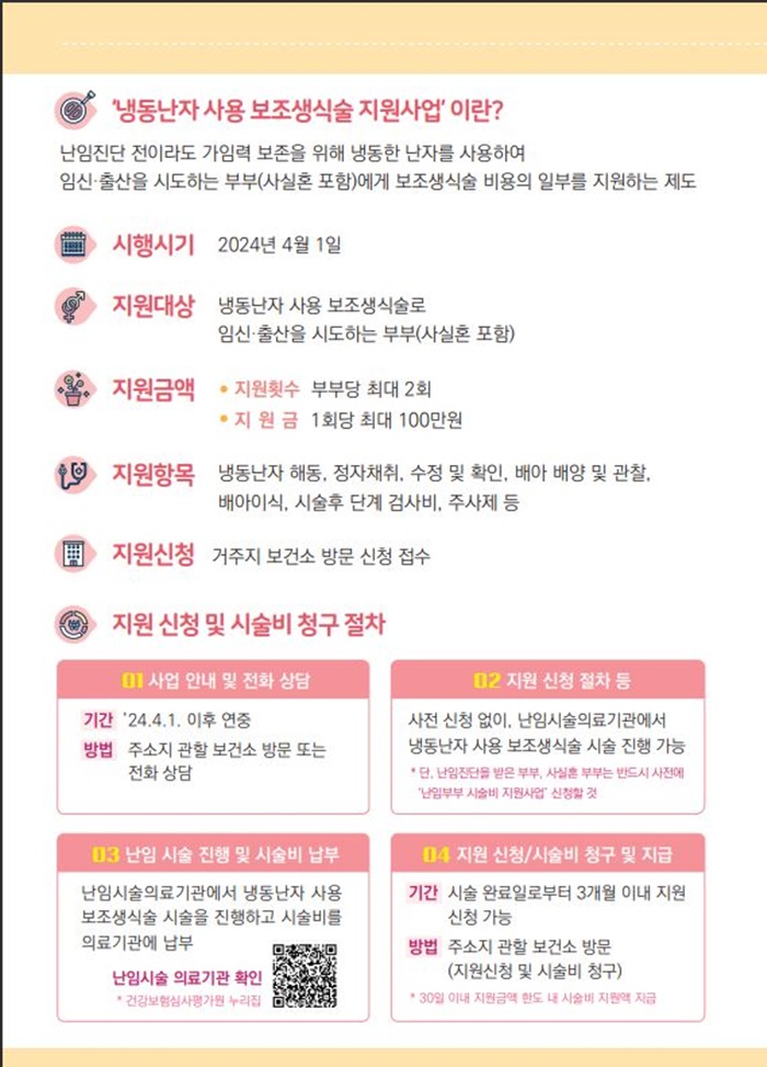 ‘³Ãµ¿³ÀÚ »ç¿ë º¸Á¶»ý½Ä¼ú Áö¿ø»ç¾÷’Àº °¡ÀÓ·Â º¸Á¸À» À§ÇØ ³Ãµ¿ÇÑ ³ÀÚ¸¦ »ç¿ëÇØ ÀӽŷÃâ»êÀ» ½ÃµµÇÏ´Â ºÎºÎ(»ç½ÇÈ¥)¸¦ ´ë»óÀ¸·Î ³Ãµ¿³ÀÚ ÇØµ¿°ú º¸Á¶»ý½Ä¼ú ºñ¿ë ÀϺθ¦ Áö¿øÇÏ´Â »ç¾÷À¸·Î ºÎºÎ¿¡°Ô ȸ´ç 100¸¸¿ø Çѵµ ³»¿¡¼ ÃÖ´ë 2ȸ±îÁö Áö¿øÇÑ´Ù.