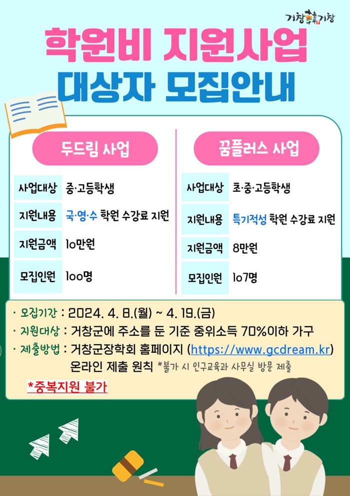 Çпøºñ Áö¿øÀ» Èñ¸ÁÇÏ´Â ´ë»óÀÚ´Â 4¿ù 8ÀϺÎÅÍ 4¿ù 19ÀϱîÁö ½Åû¼¸¦ (Àç)°ÅⱺÀåÇÐȸ ȨÆäÀÌÁö(gcdream.kr/)³ª Àα¸±³À°°ú »ç¹«½Ç·Î Á÷Á¢ Á¦ÃâÇÏ¸é µÈ´Ù.