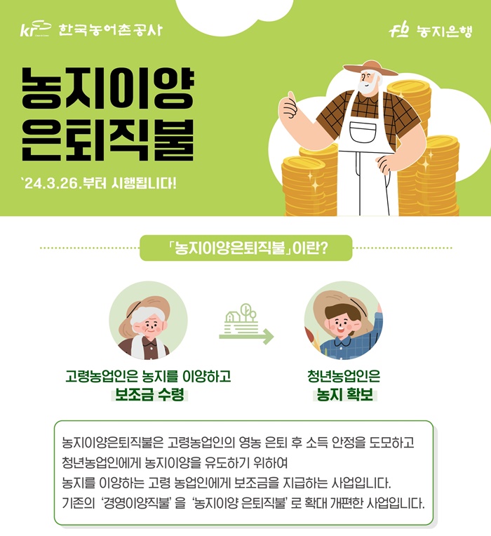 ³óÁöÀ̾ç ÀºÅðÁ÷ºÒ»ç¾÷Àº ±âÁ¸ ‘°æ¿µÀ̾ç Á÷ºÒÁ¦’¸¦ ‘³óÁöÀ̾ç ÀºÅðÁ÷ºÒ’·Î È®´ë·°³ÆíÇÑ »ç¾÷À¸·Î ³ó¾÷À» ÀºÅðÇÑ °í·É ³ó¾÷ÀÎÀÇ »ýȰ¾ÈÁ¤À» µ½±â À§ÇØ ³ó¾÷ÀÎÀÌ ¼ÒÀ¯ÇÑ ³óÁö¸¦ ³ó¾îÃ̰ø»ç¿¡ ¸Åµµ ¶Ç´Â ¸Åµµ¸¦ Á¶°ÇÀ¸·Î ÀÓ´ëÇÏ´Â °æ¿ì ¸Å¿ù ÀÏÁ¤ ±Ý¾×ÀÇ Á÷ºÒ±ÝÀ» Áö¿øÇÏ´Â Á¦µµ´Ù.