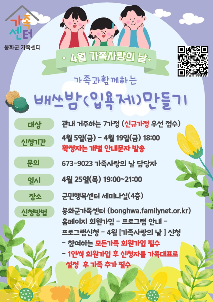 Âü°¡ Èñ¸ÁÀÚ´Â ¿À´Â 19ÀϱîÁö ºÀȱº °¡Á·¼¾ÅÍ ´©¸®Áý(http://bonghwa.familynet.or.kr)À» ÅëÇØ ȸ¿ø°¡ÀÔ ÈÄ ½ÅûÇÒ ¼ö ÀÖ´Ù.