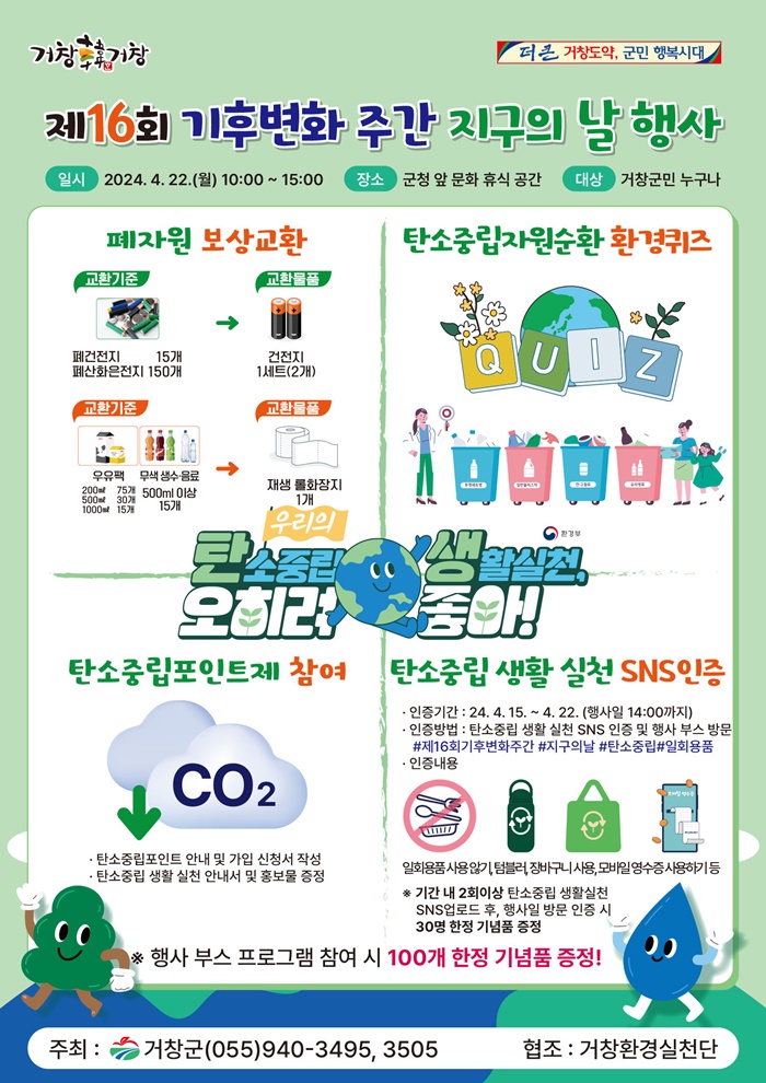 ±ºÀº À̹ø Á¦16ȸ ±âÈĺ¯ÈÁÖ°£¿¡ È«º¸ ºÎ½º ¿î¿µ, ź¼ÒÁ߸³ »ýȰ ½Çõ SNS ÀÎÁõ À̺¥Æ®, ä½ÄÀÇ ³¯, ¼ÒµîÇà»ç, 1ȸ¿ëǰ »ç¿ë ÁÙÀ̱â Ä·ÆäÀÎ µî ´Ù¾çÇÑ Çà»ç¸¦ ÁøÇàÇØ Áö±¸ÀÇ ¼ÒÁßÇÔ°ú ź¼ÒÁ߸³ ½ÇõÀÇ Á߿伺À» ¾Ë¸± °èȹÀÌ´Ù.