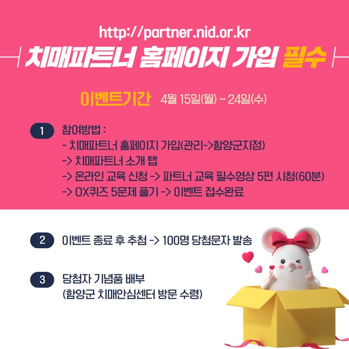 À̺¥Æ® Âü¿©¹æ¹ýÀº Ä¡¸ÅÆÄÆ®³Ê ´©¸®Áý(http://partner.nid.or.kr) °¡ÀÔ(°ü¸®→ÇԾ籺ÁöÁ¤)→Ä¡¸ÅÆÄÆ®³Ê ¼Ò°³ ÅÇ→¿Â¶óÀÎ ±³À° ½Åû→ÆÄÆ®³Ê ±³À° Çʼö ¿µ»ó(60ºÐ) ½Ãû→OXÄûÁî Ç®±â µîÀÇ °úÁ¤À» °ÅÃÄ À̺¥Æ®¿¡ Âü¿©ÇÒ ¼ö ÀÖ´Ù.