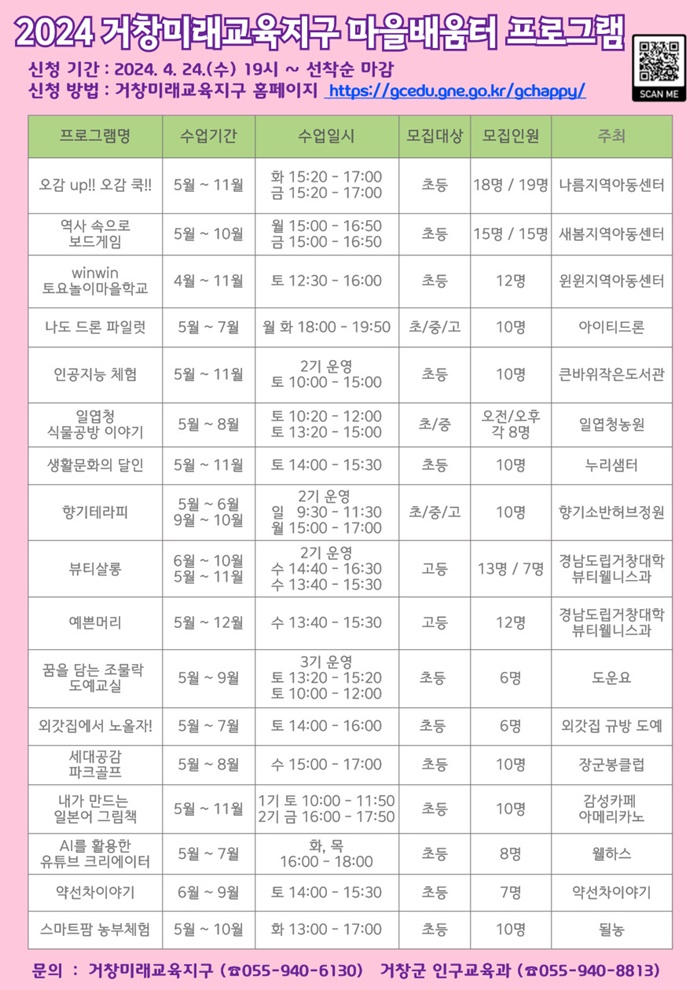 ¸¶À»¹è¿òÅÍ ¼ö¾÷À» ¼ö°ÇÏ±æ ¿øÇÏ´Â ÇлýÀº °Åâ¹Ì·¡±³À°Áö±¸ ´©¸®Áý(gcedu.gne.go.kr/gchappy)¿¡¼ ¹è¿òÅÍ º° ¼ö° ±â°£, Âü¿© Àοø, ¼ö¾÷ Àå¼Ò, ÇÁ·Î±×·¥ ³»¿ëÀ» È®ÀÎÇØ ½ÅûÇÏ¸é µÈ´Ù.