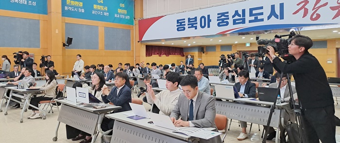 | È«³²Ç¥ â¿øÆ¯·Ê½ÃÀåÀÌ 23ÀÏ ¿ÀÈÄ 2½Ã ½Ãû ½Ã¹ÎȦ¿¡¼ 'â¿ø±¹°¡»ê´Ü 50³â ¹Ì·¡ºñÀü' ±âÀÚȸ°ßÀ» °®°í ±×µ¿¾È µµÃâµÈ ÃѰýÀûÀÎ ºñÀüÀ» ¹ßÇ¥Çϰí ÀÖ´Ù. |