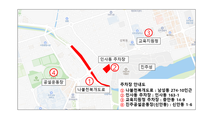 ÀÓ½ÃÁÖÂ÷ÀåÀÇ À§Ä¡´Â ³ªºÒõ º¹°³µµ·Î(³²¼ºµ¿ 274-10 ÀαÙ), Àλ絿 °ø¿ëÁÖÂ÷Àå(Àλ絿 163-1), ±³À°Áö¿øÃ» ÁÖÂ÷Àå(Á߾ȵ¿ 14-9), ÁøÁÖ°ø¼³¿îµ¿Àå(½Å¾Èµ¿ 1-1)ÀÌ´Ù. ÁÖÂ÷¸éÀº ÃÑ 870¸éÀ̸ç, ÃàÁ¦±â°£ µ¿¾È ¹«·á·Î °³¹æµÈ´Ù.