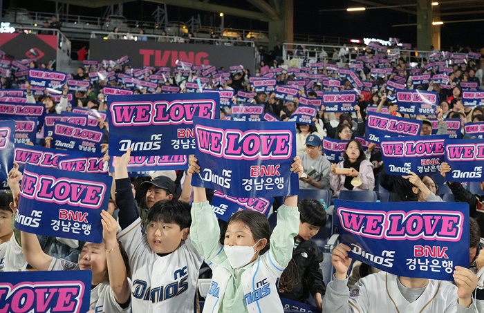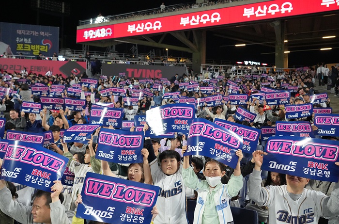 Àü±¤ÆÇÀ» ÅëÇØ BNK°æ³²ÀºÇà Á÷¿ø°ú °¡Á·µéÀÌ NC ´ÙÀ̳뽺¸¦ ÀÀ¿øÇÏ´Â ¿µ»óÀÌ ¼ÛÃâµÆÀ¸¸ç ÀÌ¿¡ È´äÇÏ´Â NC ´ÙÀ̳뽺 ¼±¼öµéÀÇ ¿µ»óÀÌ °ø°³µÆ´Ù.