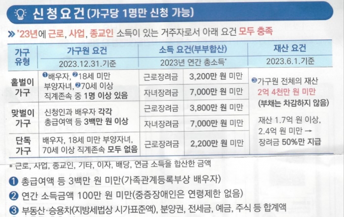 ½Åû ¿ä°ÇÀº °¡±¸´ç 1¸í¸¸ ½Åû °¡´ÉÇϰí 2023³â¿¡ ±Ù·Î, »ç¾÷, Á¾±³ÀÎ ¼ÒµæÀÌ ÀÖ´Â °ÅÁÖÀڷμ ¿ä°Ç¿¡ ¸ðµÎ ÃæÁ·µÇ¾î¾ß Çϸç Á¾Çռҵ漼 ½Å°íÀÚ¿¡ ÇÑÇÑ´Ù
