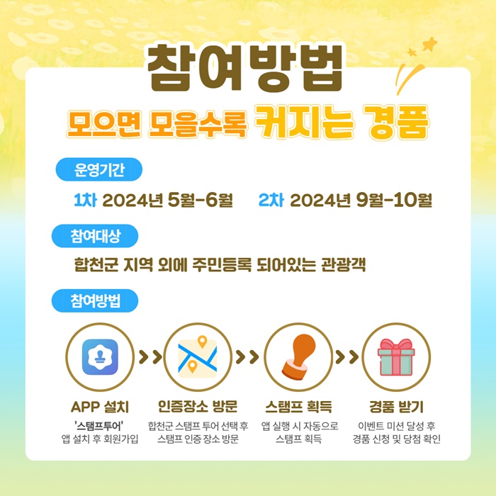 Âü¿©¹æ¹ýÀº ‘½ºÅÆÇÁ Åõ¾î’ ¾ÛÀ» ¼³Ä¡ ÇÑ ÈÄ ÄÚ½ºº° ÀÎÁõÀå¼Ò¸¦ ¹æ¹®ÇÒ °æ¿ì ÀÚµ¿À¸·Î ½ºÅÆÇÁ°¡ ȹµæµÇ´Â ¹æ½ÄÀ̸ç, 10°³ ÀÌ»óÀÇ ½ºÅÆÇÁ¸¦ ¾òÀ¸¸é Ãß÷À» ÅëÇØ ¸Å¿ù 100¸í¿¡°Ô ¸ð¹ÙÀÏ »óǰ±ÇÀ» Áö±ÞÇϰí, ½ºÅÆÇÁ °³¼ö°¡ ´Ã¾î³¯¼ö·Ï ´Ù¾çÇÑ ±â³äǰÀ» Ãß°¡·Î Áö±ÞÇÑ´Ù.
