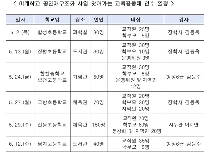 [½Ã»çÄÚ¸®¾ÆÀú³Î=Á¤Á¾¹Î ¼±ÀÓ±âÀÚ] °æ³²µµ±³À°Ã»(±³À°°¨ ¹ÚÁ¾ÈÆ)Àº 2024³â ¹Ì·¡Çб³ °ø°£À籸Á¶È»ç¾÷ ½Å±ÔÇб³ 7°³±³¸¦ ¼±Á¤Çϰí À̹ø ´Þ 2ÀϺÎÅÍ ´ÙÀ½ ´Þ 12ÀϱîÁö ±³Á÷¿ø, Çкθð, Áö¿ª¹Î µî 400¿© ¸íÀ» ´ë»óÀ¸·Î ¿¬¼ö¸¦ ½Ç½ÃÇÑ´Ù.