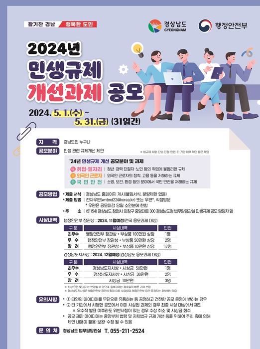 [½Ã»çÄÚ¸®¾ÆÀú³Î=ÀÌÁ¤Çý ±âÀÚ] °æ³²µµ´Â ÇàÁ¤¾ÈÀüºÎ¿Í ÇÔ²² 5¿ù 31ÀϱîÁö ‘2024³â ¹Î»ý±ÔÁ¦ °³¼±°úÁ¦ °ø¸ð’¸¦ ½Ç½ÃÇÑ´Ù°í ¹àÇû´Ù.