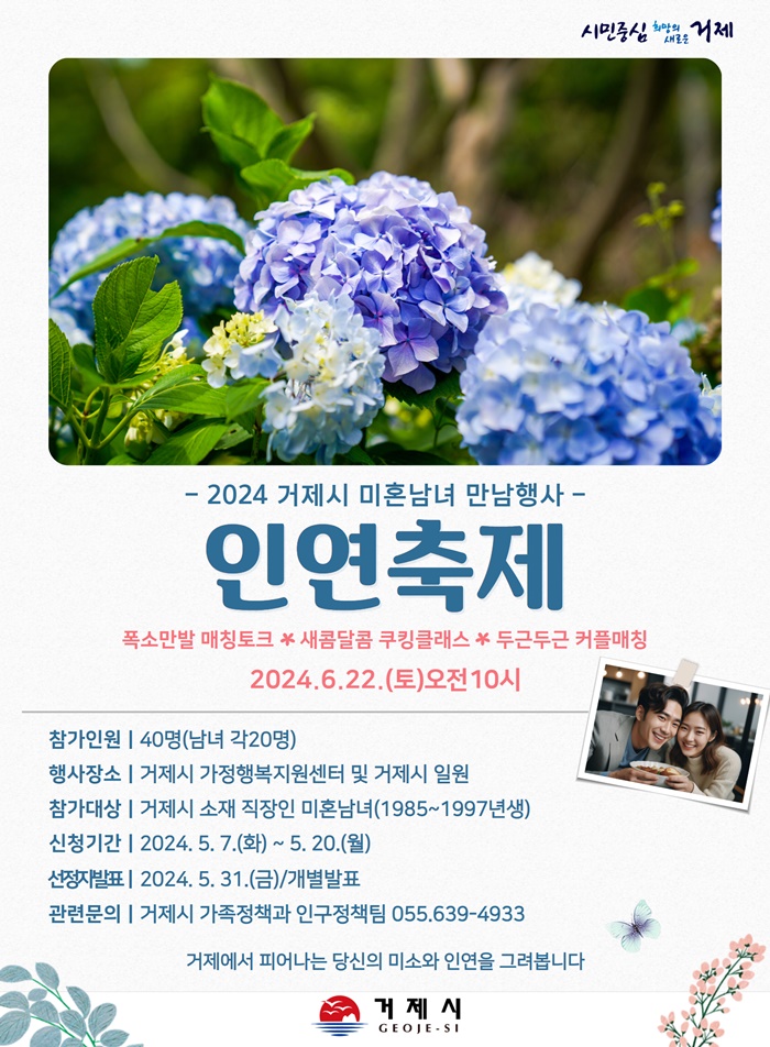 [½Ã»çÄÚ¸®¾ÆÀú³Î=Á¤Á¾¹Î ¼±ÀÓ±âÀÚ] °ÅÁ¦½Ã´Â ¿À´Â 6¿ù 22ÀÏ ¿ÀÀü 10½Ã °ü³» Á÷ÀåÀÎ ¹ÌÈ¥³²³à ´ë»ó °ÇÀüÇÑ ¸¸³²ÀÇ ±âȸ¸¦ Á¦°øÇÏ´Â °ÅÁ¦½Ã ¹ÌÈ¥³²³à ¸¸³²Çà»ç 'Àο¬ÃàÁ¦'¸¦ °³ÃÖÇÑ´Ù.