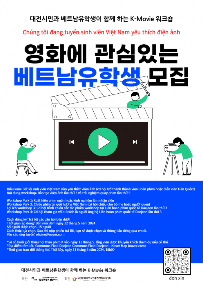 [½Ã»çÄÚ¸®¾ÆÀú³Î=ÀÌÈñ³» ±âÀÚ] ´ëÀü¿µÈÇùȸ ¾À¿µ»çÀÌ´Â ´ëÀü½Ã»çȸ¼ºñ½º¿ø(¿øÀå ±èÀνÄ) ¼Ò¼Ó ´ëÀü±¤¿ª½Ã ¿Ü±¹ÀÎÁֹΠÅëÇÕÁö¿ø¼¾ÅÍ(¼¾ÅÍÀå ±èÀ±Èñ, ÀÌÇÏ ¿Ü±¹ÀÎÁֹΠÅëÇÕÁö¿ø¼¾ÅÍ)ÀÇ Áö¿øÀ¸·Î ¿À´Â 18ÀϺÎÅÍ 8ÁÖ°£ ‘´ëÀü½Ã¹Î°ú º£Æ®³²À¯ÇлýÀÌ ÇÔ²² ÇÏ´Â K-movie ¿öÅ©¼ó’À» °³ÃÖÇÑ´Ù°í ¹àÇû´Ù.